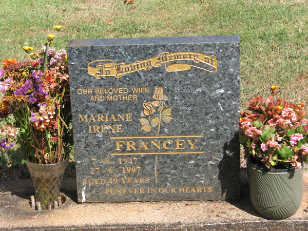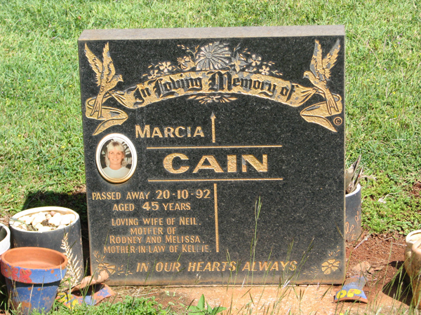 | Cain | Marcia | photo | 20/10/1992 | 45 | w/o Neil, m/o Rodney and Melissa, mother-in-law of Kellie | |