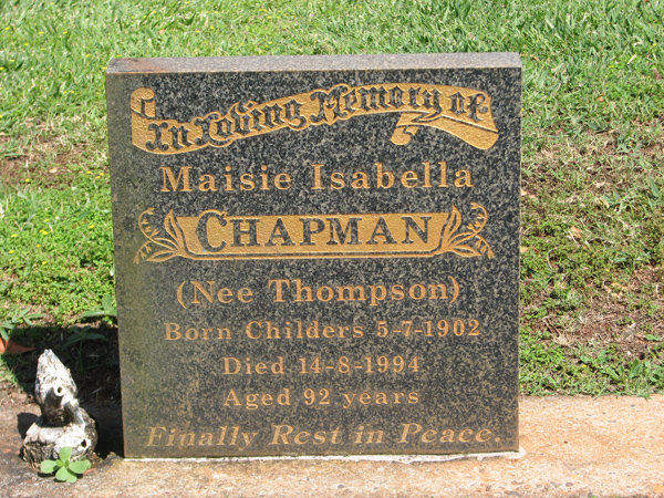 | Chapman | Maisie Isabella | photo | 5/07/1902 | 14/08/1994 | 92 | nee Thompson, born Childers |