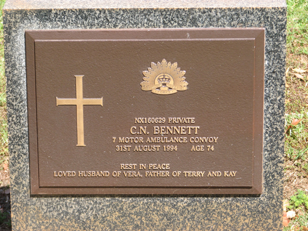 | Bennett | C N | photo | 31/08/1994 | 74 | NX160629 Private, 7 Motor Ambulance Convoy, h/o Vera, f/o Terry and Kay | |