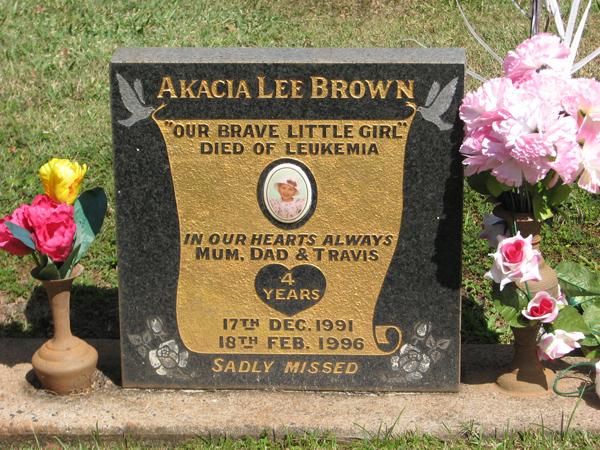 | Brown | Akacia Lee | photo | 17/12/1991 | 18/02/1996 | 4 | In our hearts always mum, dad & Travis, died of Leukemia, |