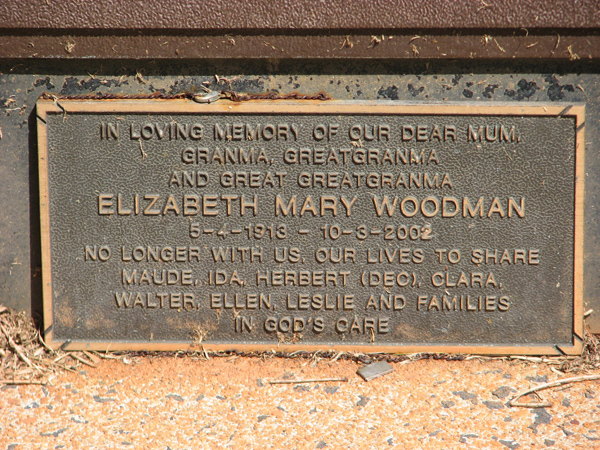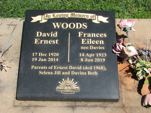 | Woods | Frances Eileen | photo | 14/04/1923 | 8/06/2019 | nee Davies, m/o Ernest David (decd 1968), Selena Jill & Davina Beth | |