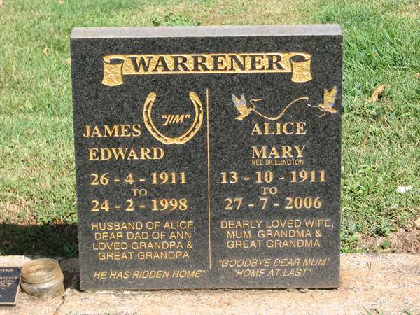 | Warrener | Alice Mary | photo | 13/10/1911 | 27/07/2006 | nee Skillington, w/o James Edward Warrener | |