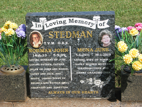 | Stedman TVM OBE | Norman John | photo | 14/06/1913 | 5/09/1999 | h/o June, father, father inlaw of John & Karen, Cathy & Jack, & Scott, poppy of Belinda & Nathan (Dec), Chantahe & Zarettha | |