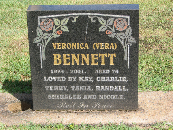 | Bennett | Veronica 'Vera' | photo | 0/0/1924 | 0/0/2001 | 76 | Loved by Kay, Charlie, Terry, Tania, Randall, Shiralee & Nicole |