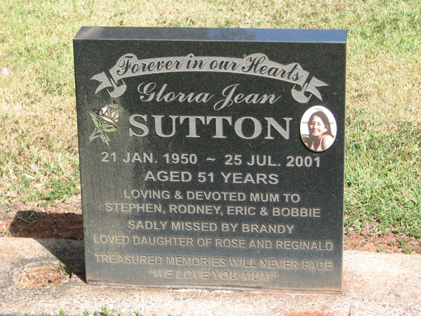| Sutton | Gloria Jean | photo | 21/01/1950 | 25/07/2001 | 51 | m/o Stephen, Rodney, Eric & Bobbie, missed by Brandy, d/o Rose & Reginald |