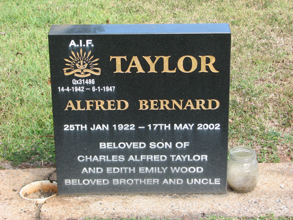 | Taylor | Alfred Bernard | photo | 25/01/1922 | 17/05/2002 | AIF QX31486 14-4-1942 to 6-1-1947, s/o Charles Alfred Taylor & Edith Emily Wood | |