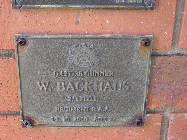 | Backhaus | W | photo | 10/10/2000 | 77 | QX27736 Gunner, 2/3 Field Regiment RAA | |
