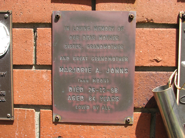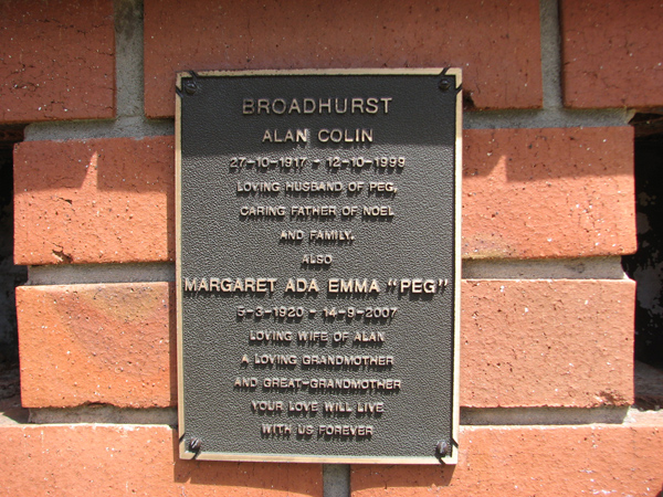 | Broadhurst | Margaret Ada Emma 'Peg' | photo | 5/03/1920 | 14/09/2007 | w/o Alan | |