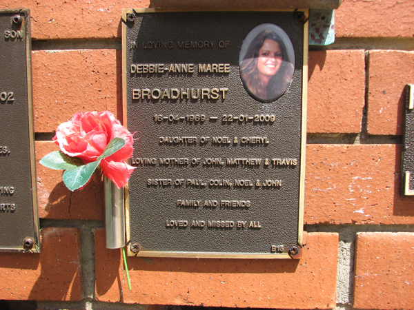 | Broadhurst | Debbie-Anne Maree | photo | 16/04/1969 | 22/01/2009 | d/o Noel & Cheryl, m/o John, Matthew & Travis, s/o Paul, Colin, Noel & John | |