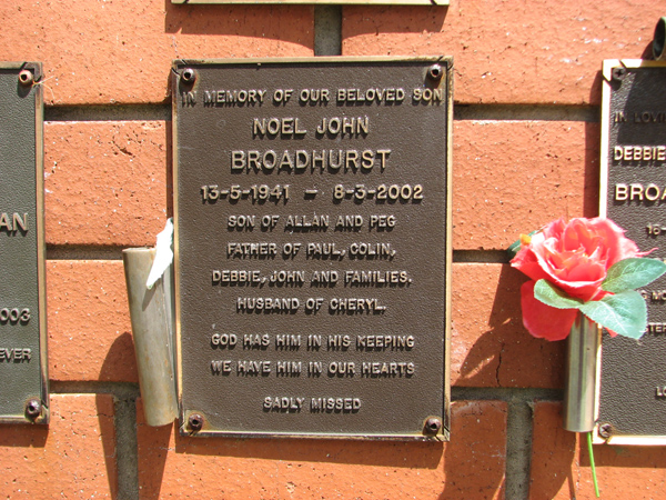 | Broadhurst | Noel John | photo | 13/05/1941 | 8/03/2002 | s/o Allan & Peg, f/o Paul, Colin, Debbie, John, h/o Cheryl | |