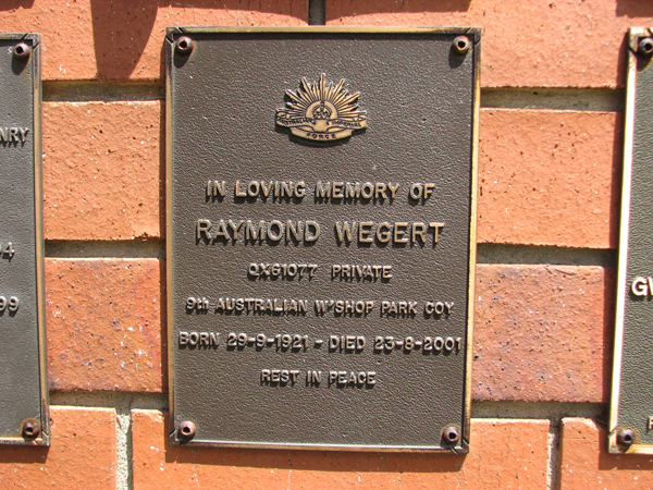 | Wegert | Raymond | photo | 29/09/1921 | 23/08/2001 | QX61077 Private, 9th Australian W'Shop Park Coy | |