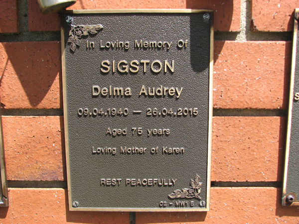 | Sigston | Delma Audrey | photo | 9/04/1940 | 26/04/2015 | 75 | m/o Karen |