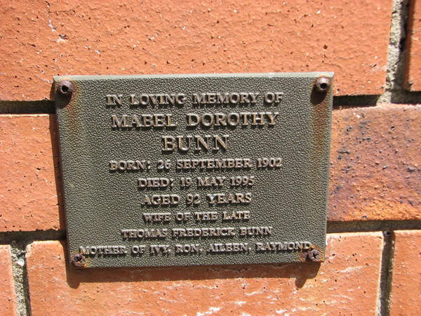 | Bunn | Mabel Dorothy | photo | 26/09/1902 | 19/05/1995 | 92 | w/o the late Thomas Frederick Bunn, m/o Ivy, Ron, Aileen, Raymond |