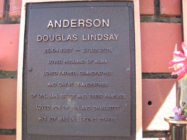 | Anderson | Douglas Lindsay | photo | 25/04/1927 | 27/02/2015 | h/o Alma, father, grandfather and Great Granfather of Lyn, Jan, Bruce, s/o Ben & Charlotte | |