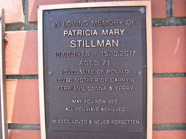 | Stillman | Patricia Mary | photo | 16/06/1946 | 15/10/2017 | 71 | w/o Ronald m/o Darryn, Terriann, Donna & Terry |