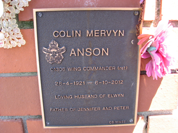 | Anson | Colin Mervyn | photo | 28/04/1921 | 6/10/2012 | 01306 Wing Commander (ret) RAAF, h/o Elwyn f/o Jennifer & Peter | |