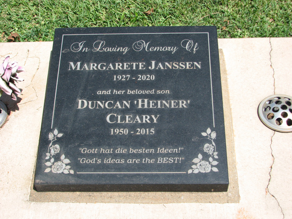 | Cleary | Duncan 'Heiner' | photo | 0/0/1950 | 0/0/2015 | s/o Margarete Janssen | |
