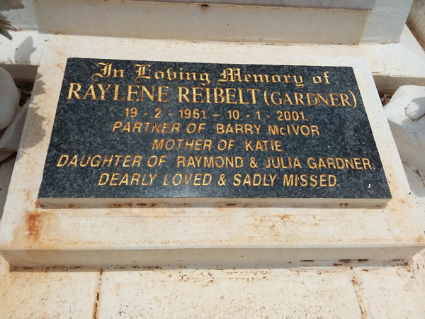 | Reibelt | Raylene (Gardner) | photo | 19/02/1961 | 10/01/2001 | Partner of Barry McIvor m/o Katie d/o Raymond & Julia Gardner | ||