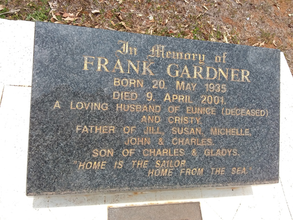 | Gardner | Frank | photo | 20/05/1935 | 9/04/2001 | h/o Eunice (Dec) & Cristy f/o Jill, Susan, Michelle, John & Charles s/o Charles & Gladys | ||
