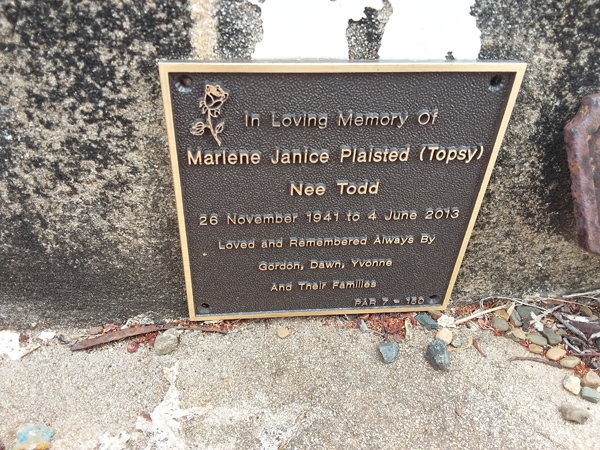 | Plaisted | Marlene Janice (Topsy) | photo | 26/11/1941 | 4/06/2013 | nee Todd, remembered by Gordon, Dawn, Yvonne | ||