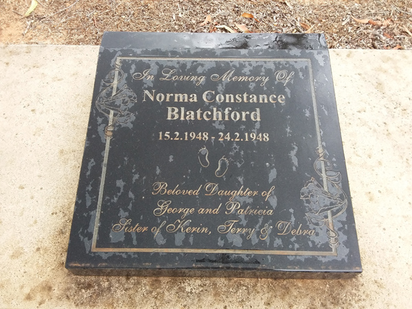 | Blatchford | Norma Constance | photo | 15/02/1948 | 24/02/1948 | d/o George and Patricia, s/o Kerin, Terry & Debra | ||