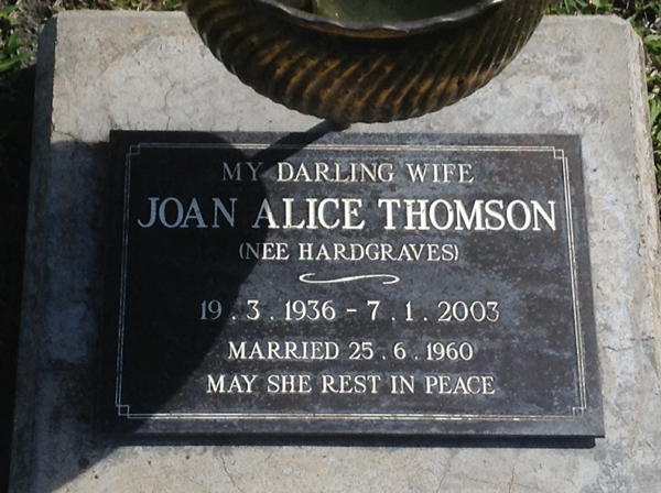 | Thomson | Joan Alice | photo | 34 | 19/03/1936 | 7/01/2003 | nee Hardgraves married 25/6/1960 | ||