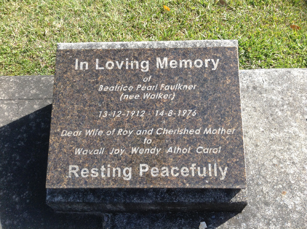 | Faulkner | Beatrice Pearl | photo | 36 | 13/12/1912 | 14/08/1976 | w/o Roy m/o Wavall, Joy, Wendy, Athol, Carol | ||