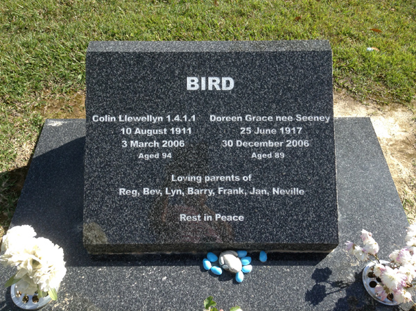 | Bird | Colin Llewellyn | photo | 39 | 10/08/1911 | 3/03/2006 | 94 | f/o Reg, Bev, Lyn, Barry, Frank, Jan, Neville | |