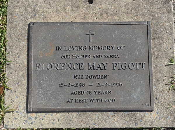 | Pigott | Florence May | photo | 59 | 15/2/1898 | 21/09/1996 | 98 | nee Dowden | |