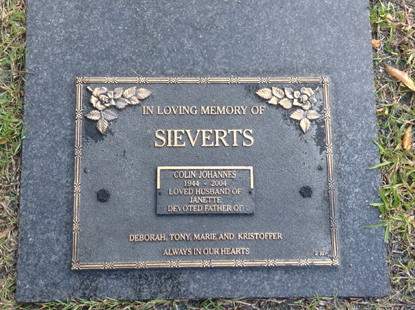 | Sieverts | Colin Johannes | photo | 149 | 0/0/1944 | 0/0/2004 | h/o Janette f/o Deborah, Tony, Marie & Kristoffer | ||