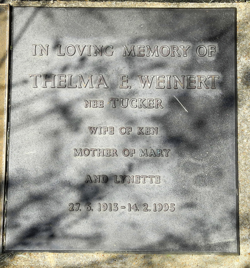 | WEINERT nee TUCKER | Thelma E | Photo | 14-2-1995 | Wife of Ken, mother of Mary & Lynette |