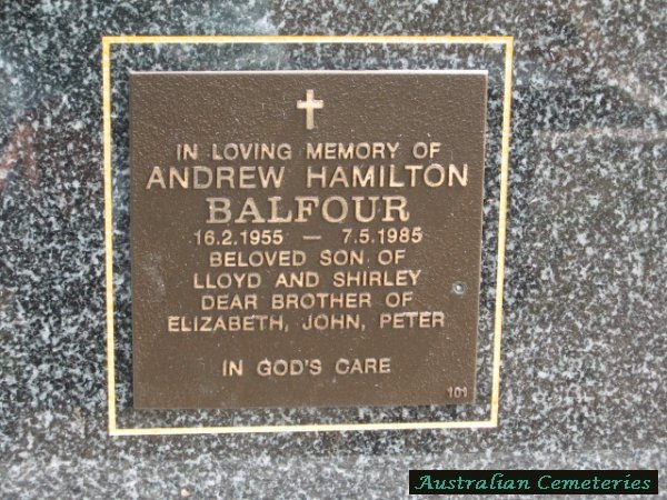 | BALFOUR | Andrew Hamilton | photo | 16/2/1955 | 7/5/1985 | par Lloyd & Shirley Balfour,bro to Elizabeth,John,Peter | ||