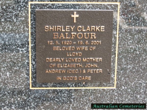 | BALFOUR | Shirley Clarke | photo | 12/5/1920 | 19/6/2001 | Lloyd | mother to Elizabeth,John,Andrew (dec),Peter,buried with mother Daisy Watson | |