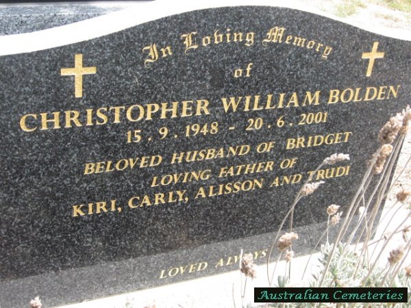 | BOLDEN | Christopher William | photo | 15/9/1948 | 20/6/2001 | Bridget | father to Kiri,Carly,Alisson,Trudi | |