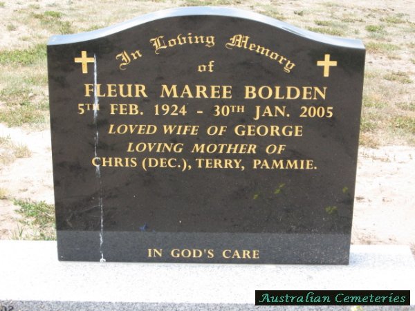 | BOLDEN | Fleur Maree | photo | 5/2/1924 | 30/1/2005 | George | mother to Chris (dec),Terry,Pammie | |