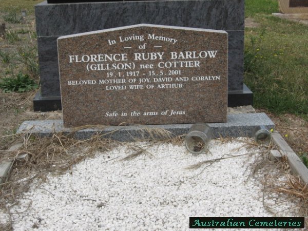 | BARLOW | Florence Ruby | photo | 19/1/1917 | 15/5/2001 | Arthur | nee Gillson & Cottier,mother to Joy,David,Coralyn | |