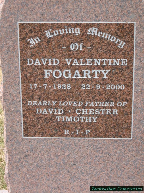 | FOGARTY | David Valentine | photo | 17/7/1928 | 22/9/2000 | father to David,Chester,Timothy | ||