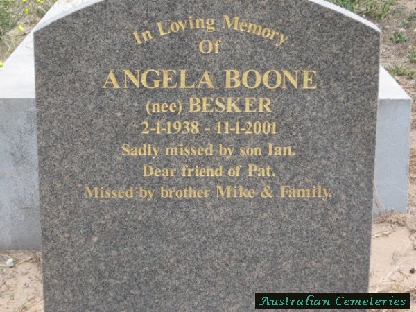 | BOONE | Angela | photo | 2/1/1938 | 11/1/2001 | nee Besker,mother to Ian,sis to Mike & family | ||