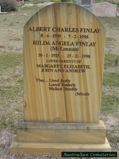 | FINLAY | Hilda Angela | photo | 30/1/1915 | 25/2/1998 | Albert C. | nee McLennan,mother to Margaret,Elizabeth,John,Andrew | |