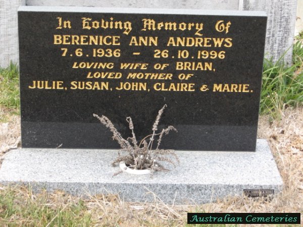 | ANDREWS | Berenice Ann | photo | 7/6/1936 | 26/10/1996 | Brian | mother to Julie,Susan,John,Claire,Marie | |
