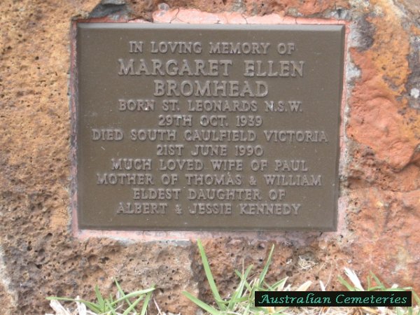 | BROMHEAD | Margaret Ellen | photo | 29/10/1939 | 21/6/1990 | Paul | par Albert & Jessie Kennedy,born St LeonardsNSW,died Caulfield Vic,mother to Thomas & William. | |
