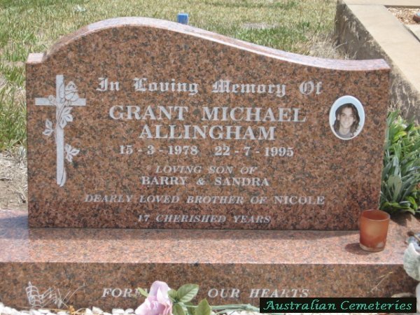 | ALLINGHAM | Grant Michael | photo | 15/3/1978 | 22/7/1995 | par Barry & Sandra,bro to Nicole | ||