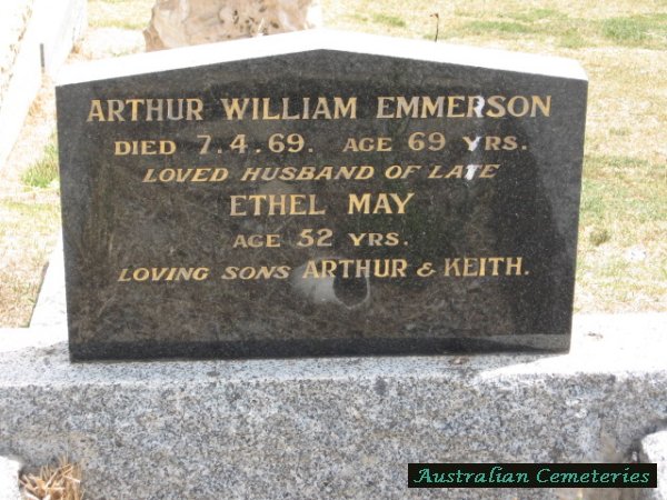 | EMMERSON | Arthur William | photo | 7/4/1969 | 69 | Ethel M. | par Reuben & kate E Emmerson,father to Arthur & Keith | |
