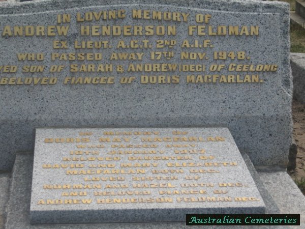 | FELDMAN | Andrew Henderson | photo | 17/11/1948 | par Sarah & Andrew (dec) of Geelong,buried with Fiancee of Doris M MacFarlan | |||