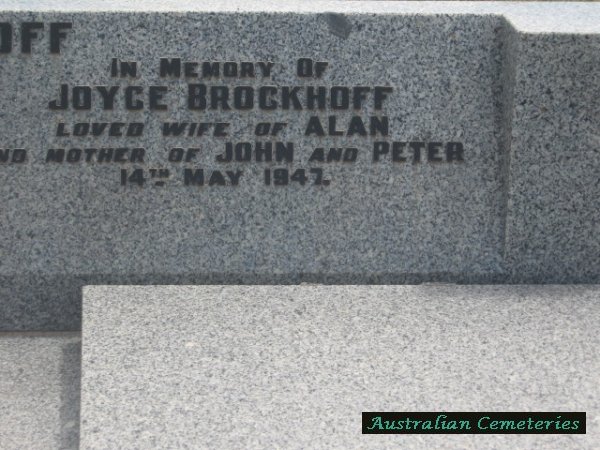 | BROCKHOFF | Joyce (Alice) | photo | 14/5/1947 | 41 | Alan | par Archiebald & Alice Johnson, mother to John & Peter | |