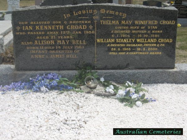| BELL | Alison May | photo | 11/7/1963 | 14/7/1963 | buried with Ian K &Thelma M.W & William S.W. CROAD,par Anne & James BELL | ||