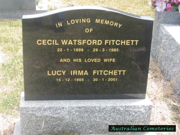 | FITCHETT | Lucy Irma | photo | 15/12/1905 | 30/1/2001 | Cecil W | ||