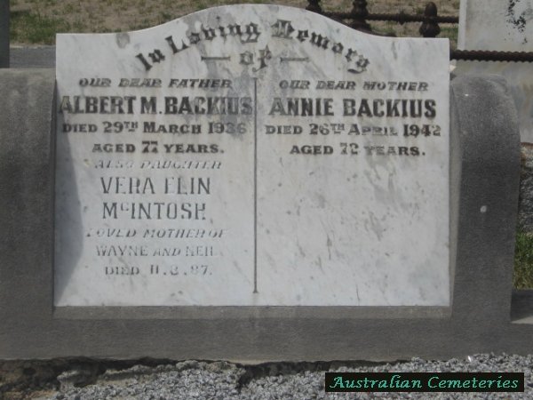 | BACKIUS | Albert M. | photo | 29/3/1936 | 77 | Annie | buried with daughter Vera Elin McIntosh | |