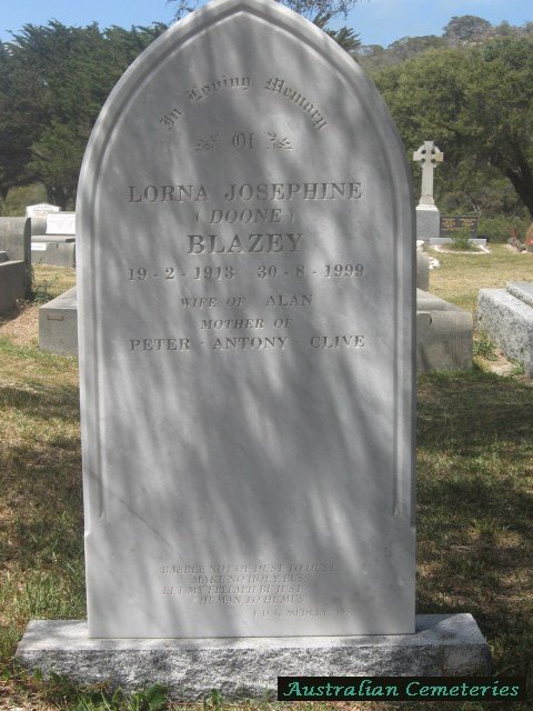 | BLAZEY | Lorna Josephine | photo | 19/2/1913 | 30/8/1999 | Alan | nee Doone,mother to Peter,Antony,Clive | |