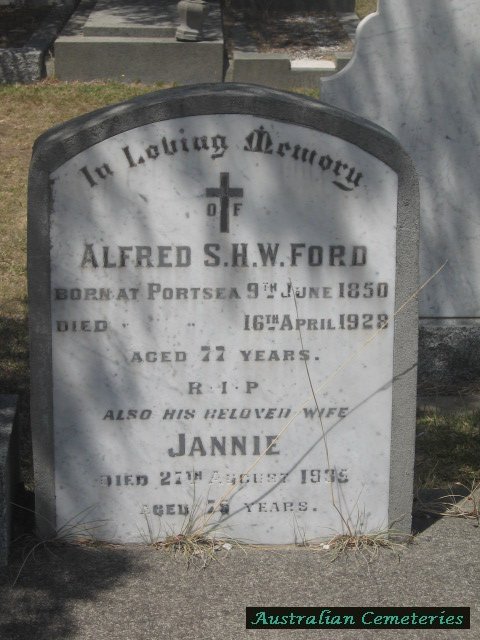 | FORD | Alfred S.H.(Samuel Hy) | photo | 9/6/1850 | 16/4/1928 | 77 | Jannie | par James S & Hannah Ford. |